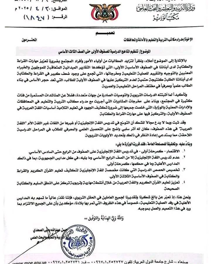 وبحسب التعميم، فإن القرار استند لمراجعات ميدانية ومطالبات واسعة من أولياء الأمور والتربويين، إضافة إلى نتائج تقييمات وطنية ودولية أظهرت تدنيًا ملحوظًا في مهارات القراءة والكتابة لدى تلاميذ المراحل الأولى.