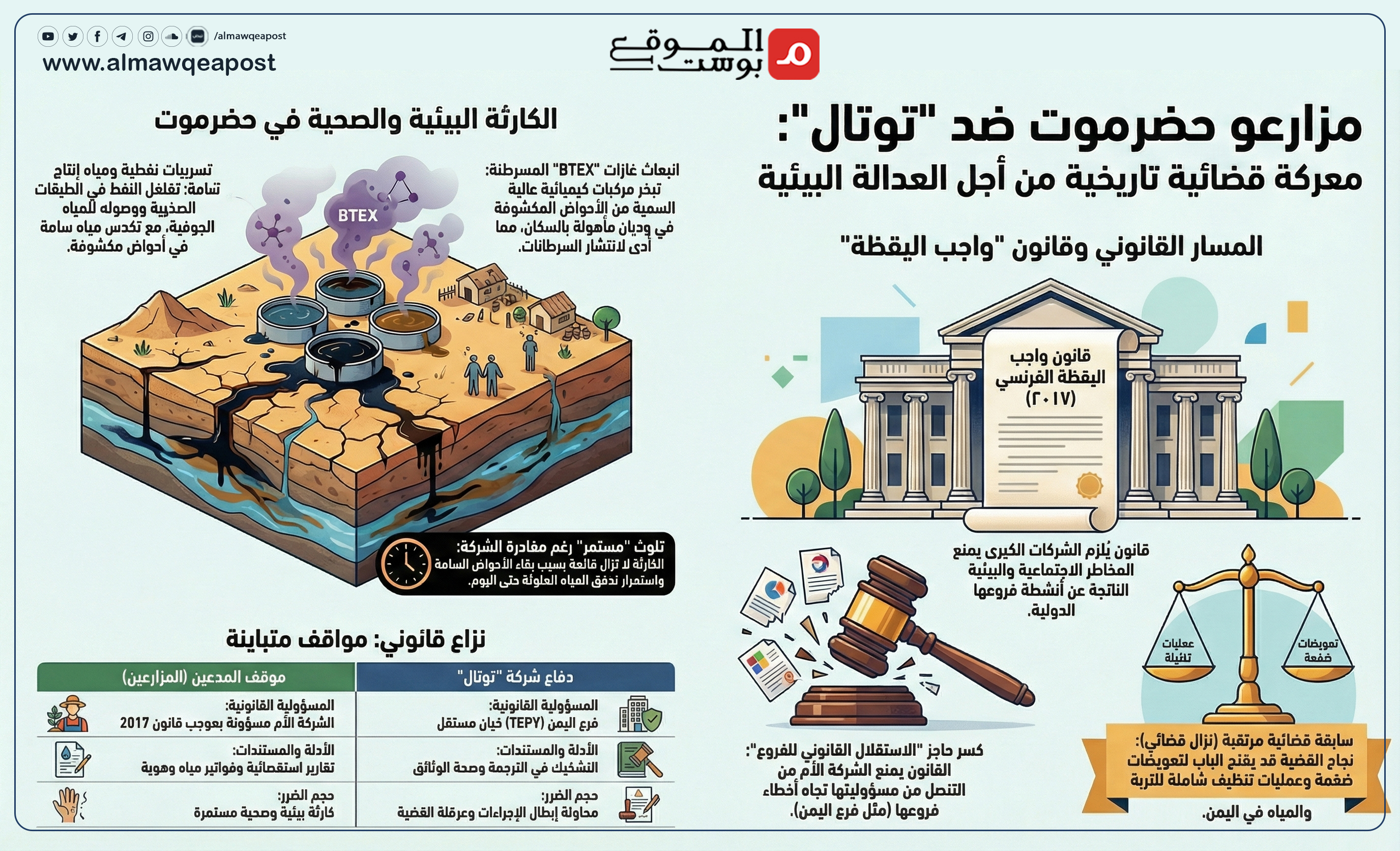 وفي حال قررت القاضية المضي قدماً، فإننا أمام "زلزال قضائي" قد ينتهي بإلزام توتال بعملية تنظيف شاملة لتربة ومياه حضرموت، وتعويض الضحايا عن الأمراض المسرطنة التي أصابتهم.